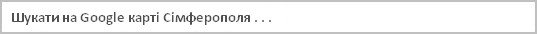 Форма пошуку «Шукати на Google мапі Сімферополя». Використовуйте пошук, щоб показати на мапі будинок, вулицю, площу, набережну, міст, проспект, завод, лікарню, ресторан, бар, кінотеатр, стадіон, магазин, готель, торговий центр, аптеку, банкомат, організацію, фірму, банк, компанію, фітнес клуб, автосервіс, АЗС, будь-яке місце або об’єкт у м. Сімферополь. Введіть адресу або назву шуканого об’єкта в спеціальне поле (українською / російською або будь-якою іноземною мовою).